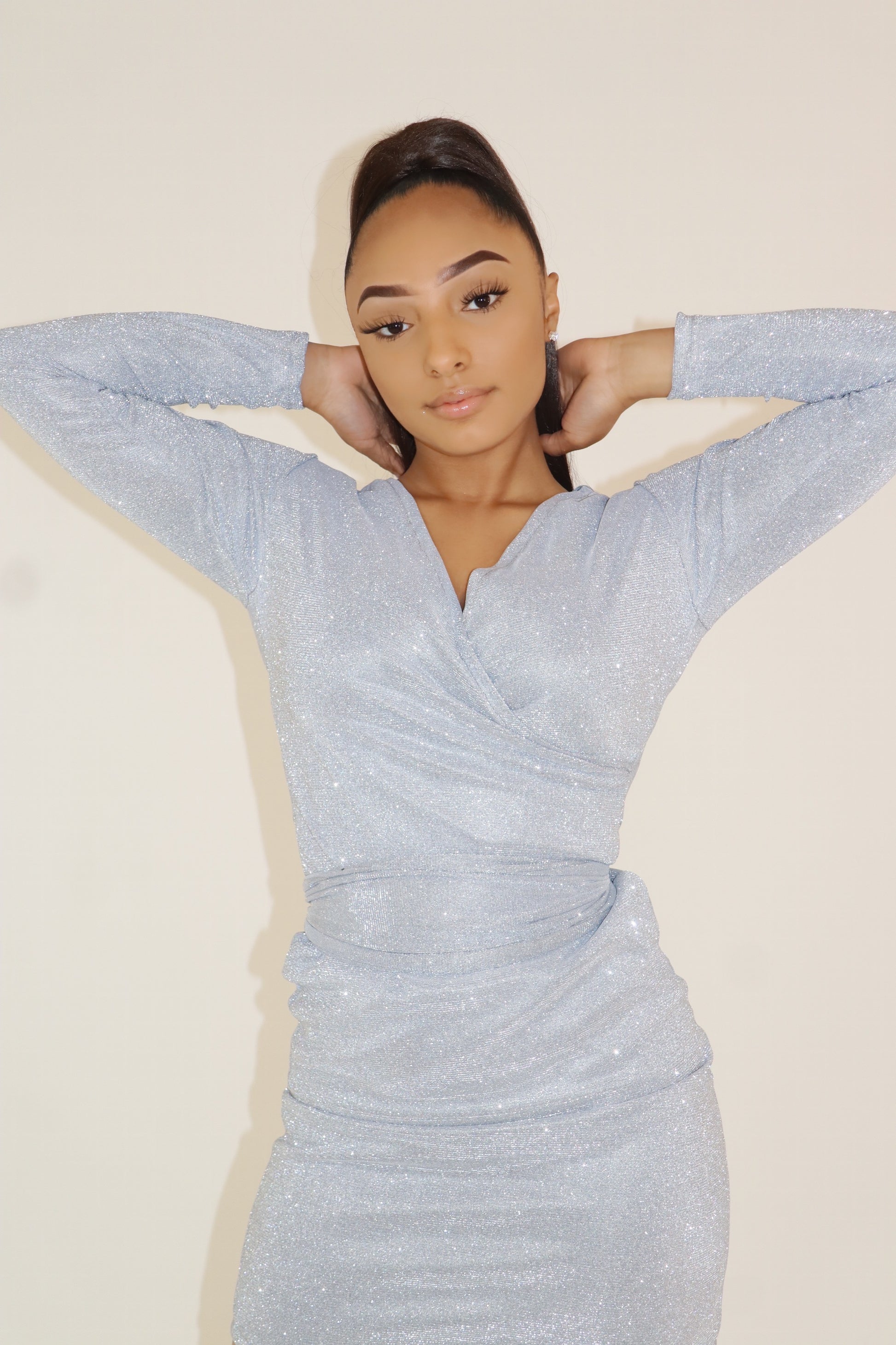 Shine Bright this season in the Silver Wrap Over Glitter Dress. This piece is very limited and handmade from scratch to its finest detail. This Fabric is stretch, designed for a perfect comfortable fit.