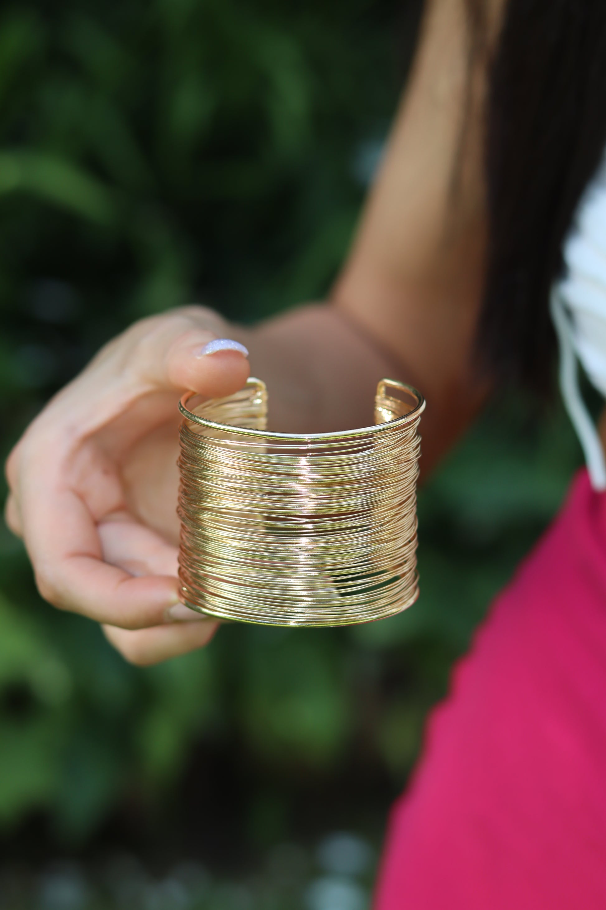 Minimalist thick gold bracelet this can be worn in the arm the bangle is adjustable and can be worn on the arm for a stylish unique look.