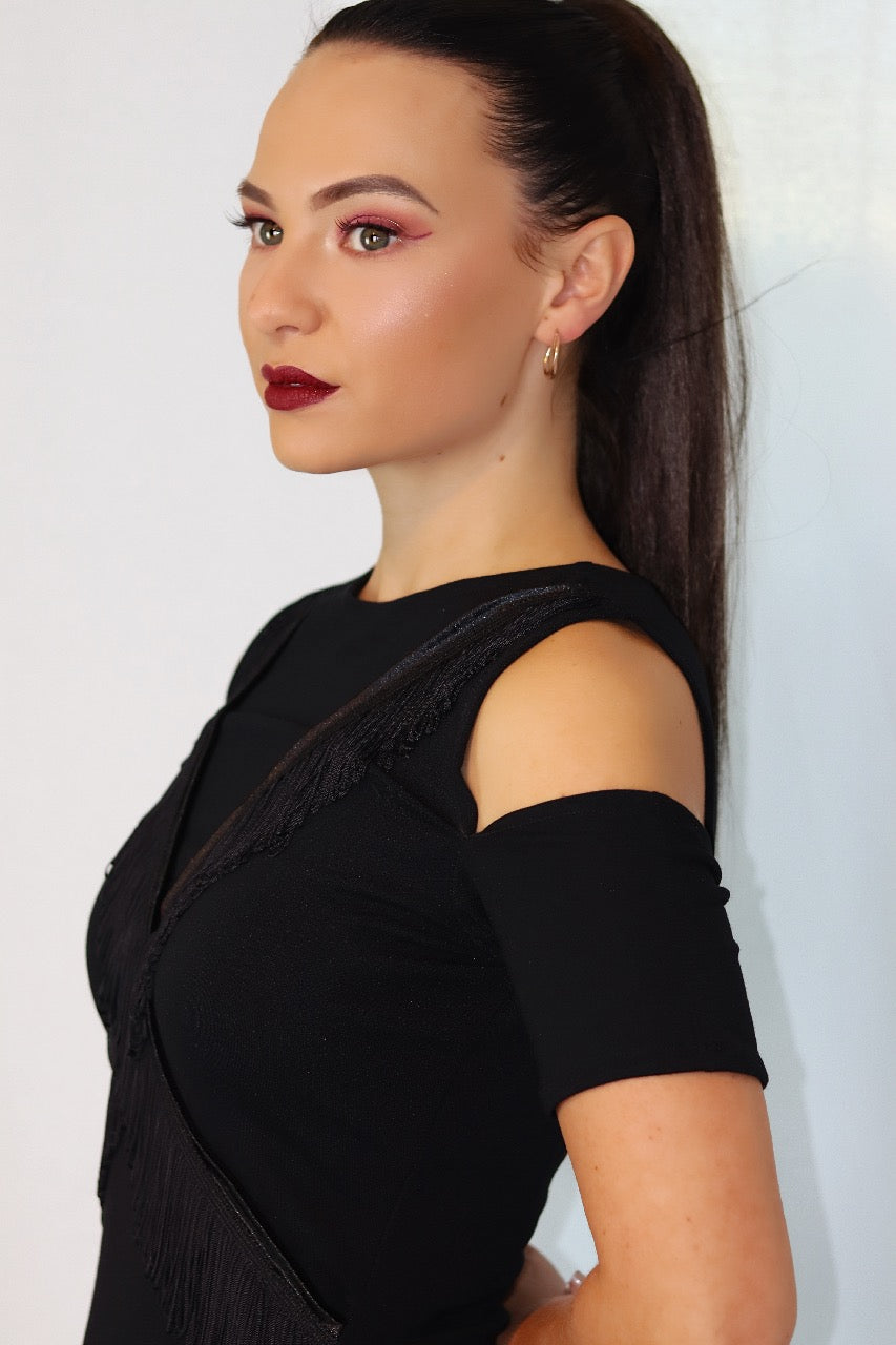 This fabric is made out of soft stretch Jersey with velvet trimmings which is carefully sewn on stretch tassels that is then placed across each side of the dress with a finishing touch off the shoulder short sleeves to give the dress a unique stylish look.