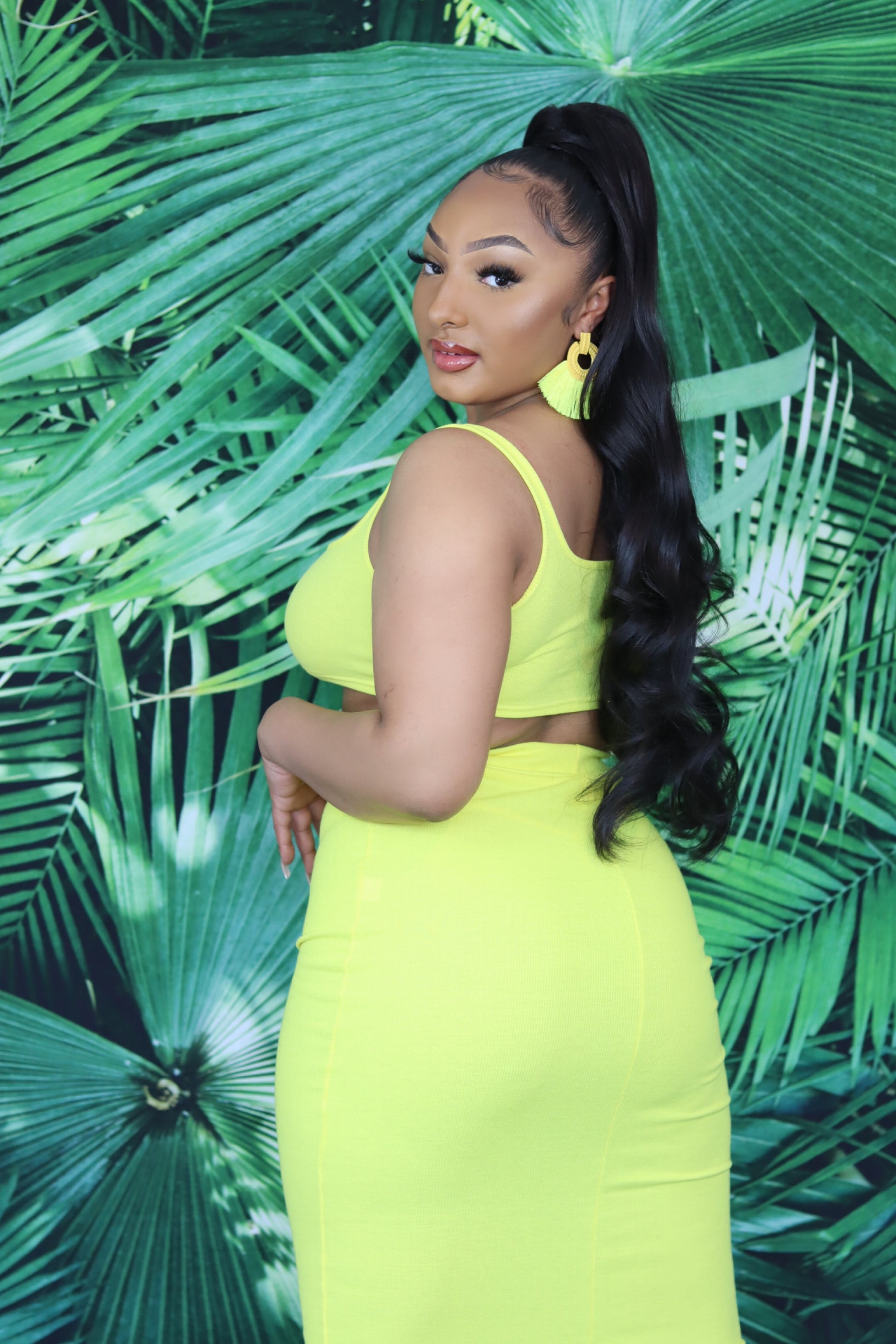 Update your wardrobe with this colourful vibrant crop top. Featuring a yellow ribbed knitted material with a square neckline and a cropped length. Wear this with our matching skirt and with style it with some sneakers or heels.